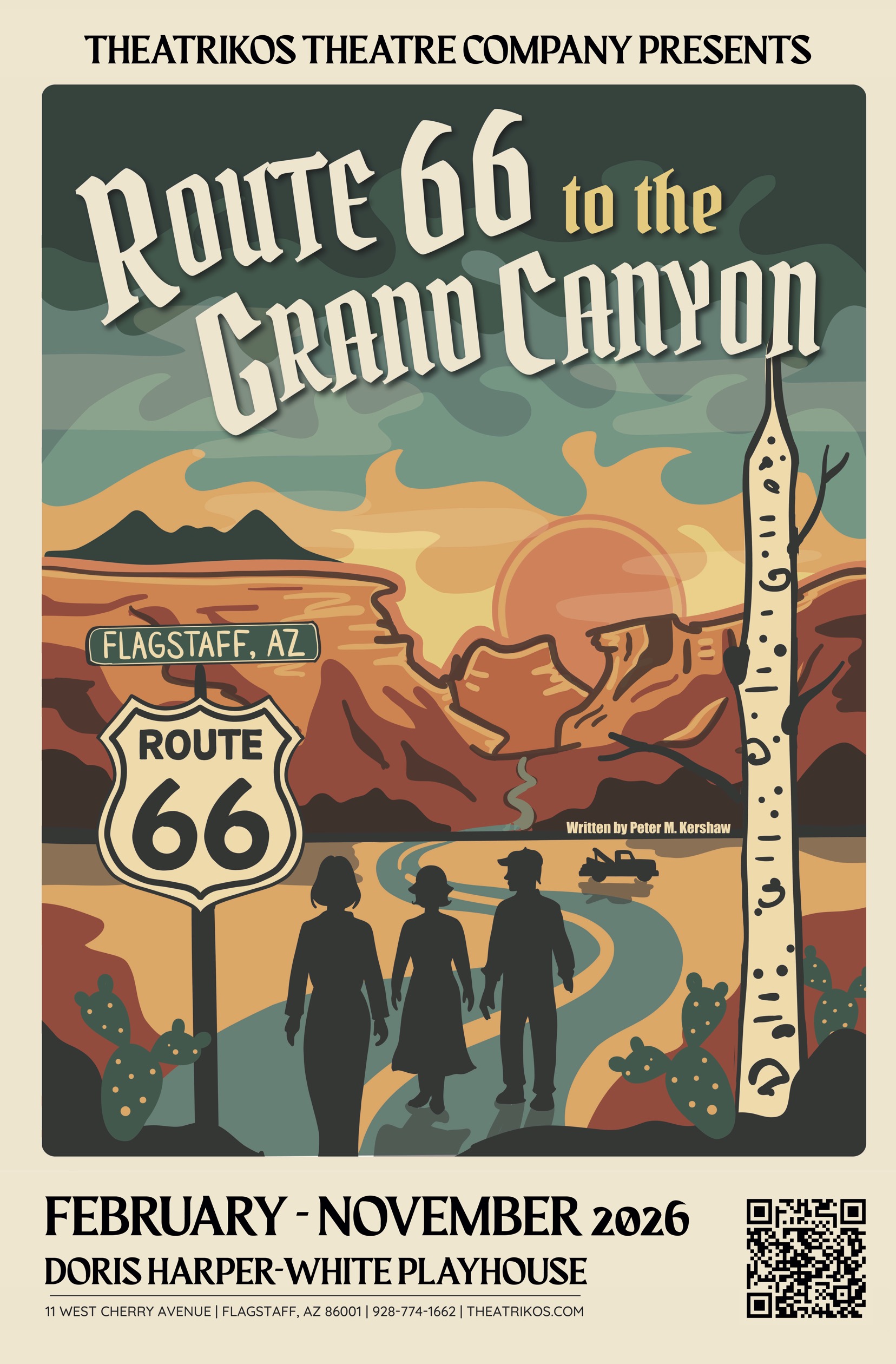 Written by acclaimed filmmaker and writer Peter Kershaw and directed by longtime Theatrikos veteran John Propster, Route 66 to the Grand Canyon is a farcical, magical journey down the Mother Road, filled with laughs, local lore, and the legendary spirit of Northern Arizona.